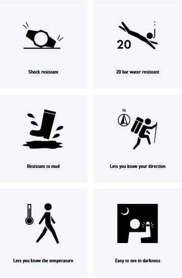 This is a Twin Sensor model from the G-Shock Mudmaster Series, designed for use in extreme environments scattered with rubble, dirt and debris. With a push of one large button at the 3 o'clock position, you can check your position with its Compass. The temperature can also be measured easily by pushing the button at 4 o'clock. This model has been developed with operability in mind so that anyone can intuitively check their position using the Compass, even in the most extreme climates, without visual observation. The dust and mud-resistant button guard cylinder structure prevents fine sand and mud from getting into the buttons while also helping to absorb any shock to the buttons and improving operability. Broad hour/minute hands and indices of large Arabic numerals have also been adopted to improve visibility. This design is packed with military-style flare, including a mode display that uses a sprocket-inspired disk dial and a textured band to prevent slipping.