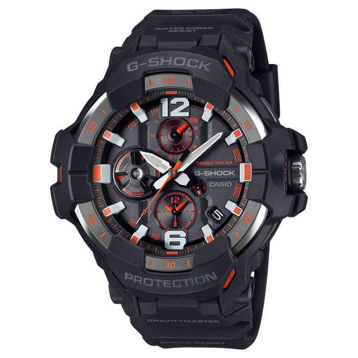 The skys the limit! Introducing the GRAVITYMASTER GRB300, a piece of aviation-inspired professional gear designed to work even in the harshest environments, from the G-SHOCK MASTER of G line. The GRB300 features a Carbon Core Guard structure, which delivers the shock-resistance, rigidity, and corrosion-resistance of carbon material used in aircraft fuselages. The carbon fiber-reinforced resin case and the seamless bezel design inspired by next-generation aircraft come together in a bold and powerful form.