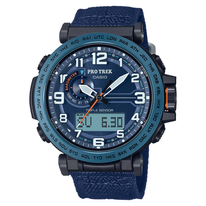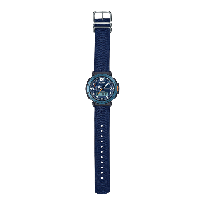 Get the PRO TREK PRG-601YB with cloth band, featuring materials expected to reduce environmental impact and big bold index numbers for an easy read. The digital compass, barometer/altimeter, and thermometer Triple Sensor helps you stay on top of changes in the natural environment, while Tough Solar converts light into the energy needed to power the watch. The raised index numbers on the dial are boldly balanced with a wide ion-plated stainless steel bezel. The resin components used for the case and case back are made with bio-based resin materials, and the cloth band is made with materials from recycled plastic bottles. These materials are expected to reduce the ecological footprint of this watch.