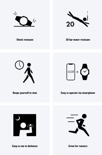 Features: Step Tracker / Auto Lap / Stopwatch / Countdown Timer / Phone Notifications / World Time / Training Log / Phone Finder