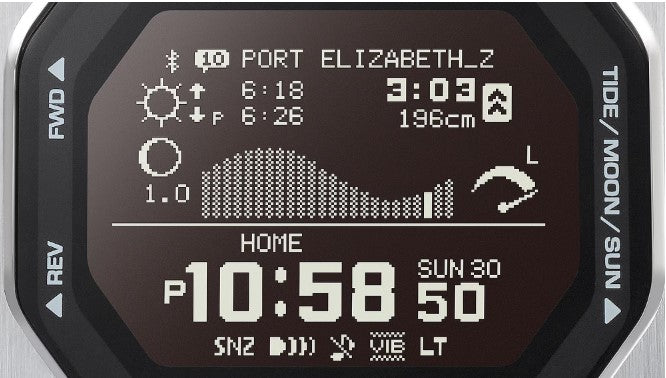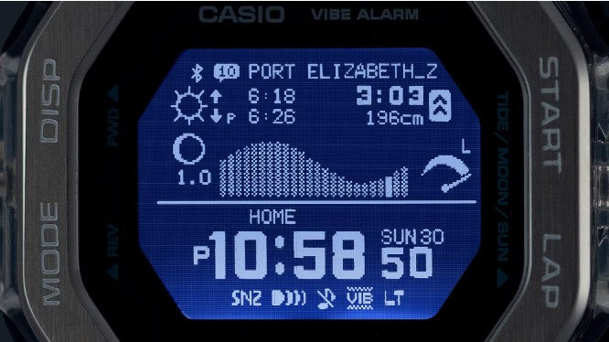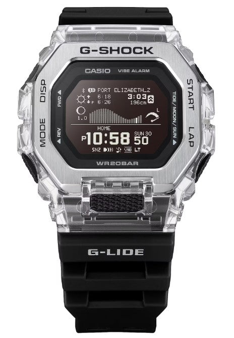 This is a model from the G-Shock G-LIDE Series, designed for extreme water activities and built to meet the demands of surfers and outdoor athletes. It features a high-resolution Memory-in-Pixel (MIP) LCD display that delivers clear visibility of tide graphs, moon data, sunrise and sunset times, and other vital information, even in bright sunlight or low-light conditions.