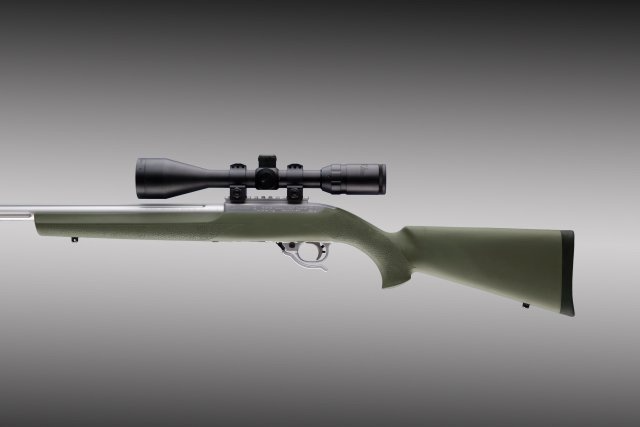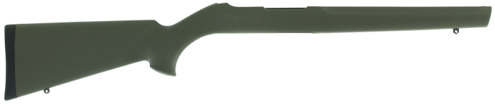 Hogue Stocks come standard with aluminum pillar bedding. These pillars, inserted at critical action mounting bolt locations, guarantee an accurate, rock-solid action fit that will not shoot loose. The OverMolded Stock does not use the original barrel band, but does utilize the original stock attachment screw. It is not compatible with look-alike lever action model rifles. This model has an OD green finish and is compatible with Ruger 10/22 with .920" barrel channel.