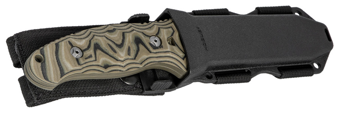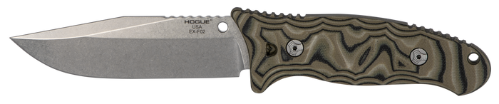 Hogue's fixed blade designs have been developed to meet the requirements of professionals and adventurers alike. Created specifically with the outdoorsman in mind, the EX-F02 features a G-10 rubber handle for grip-ability and finger detent in the handle. The tumble polished finished blade has a serrated thumb-ramp and hand honed edge. Handle has lanyard/lashing holes.