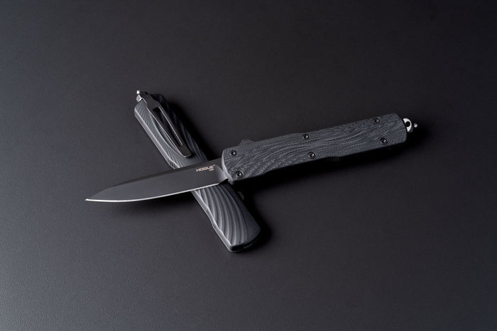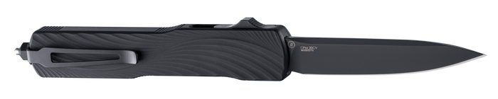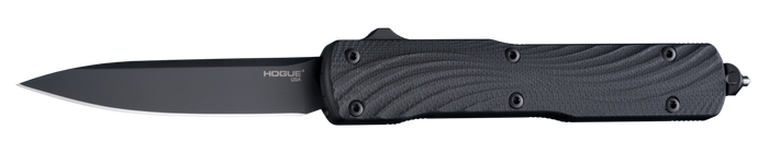 The Hogue Counterstrike OTF knife with a carbide glass breaker and lanyard hole features a 3.35" Cryogenically heat treated blade black PVD blade, hand sharpened and honed edge.