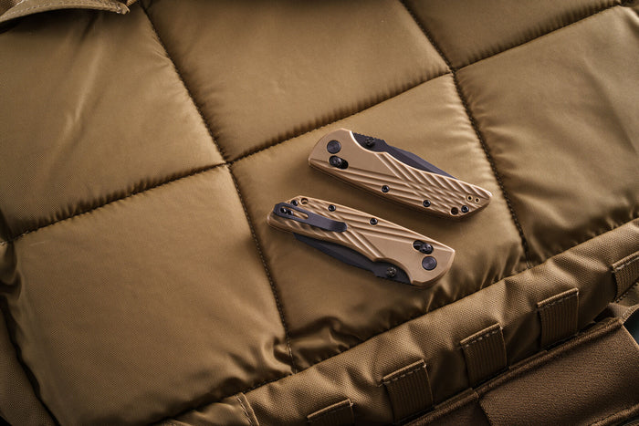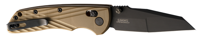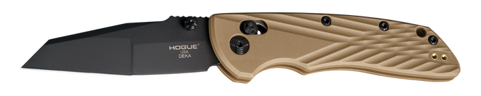 The Deka folding knife features a 3.25:" flat dark earth Cerakote plain blade that's been Cryogenically heat treated, hand honed flat grind blade and a Wharncliffe type blade with ambidextrous thumb studs. Includes pocket clip.